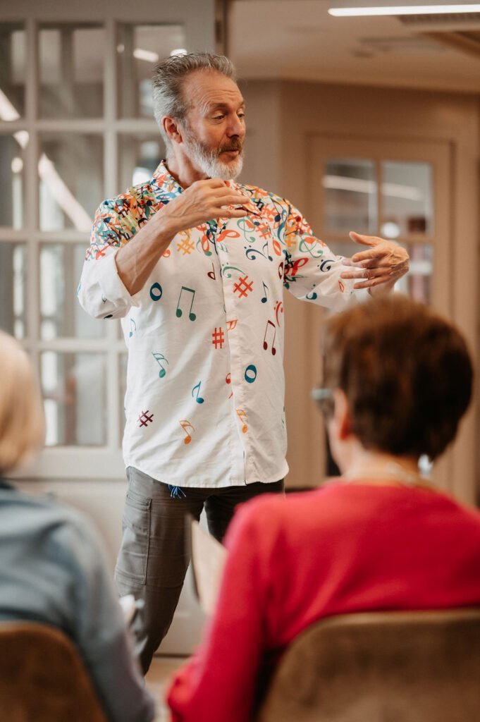 Het is bijzonder om Henny’s ervaringen te horen. “Zingen heeft een andere aansturing dan de spraak”, zegt hij. “Er zijn hier bewoners die moeizaam of bijna niet spreken. Maar bij het zingen kunnen ze de teksten wél uitspreken. Dat geeft eigenwaarde. Je ziet dat mensen uit een isolement komen.”