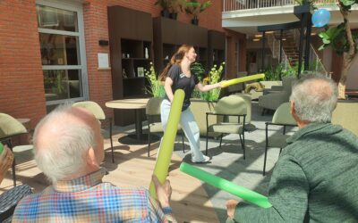 In het Amadeushuis geeft ze onder andere valpreventielessen, doet zit-yoga, puzzelt met bewoners – “dat is motorisch goed voor je vingers” – speelt jeu de boules en voetbalt. “Vooral de mannen houden van dat laatste. We hebben krukjes met wieltjes dus we kunnen zittend voetballen of we gaan overschieten.”